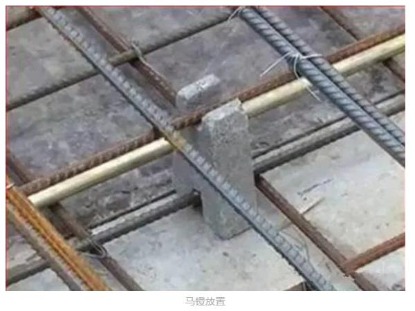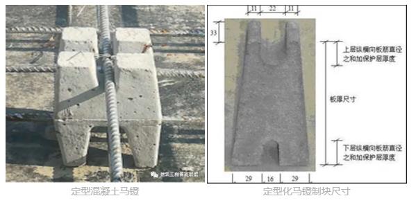 定型混凝土马镫:马镫高度同板厚,上部弧形凹槽深度为板上部纵横向钢筋直径之和加上板保护层尺寸,下部弧形凹槽深度为板下部纵横向钢筋直径之和加上板保护层尺寸。