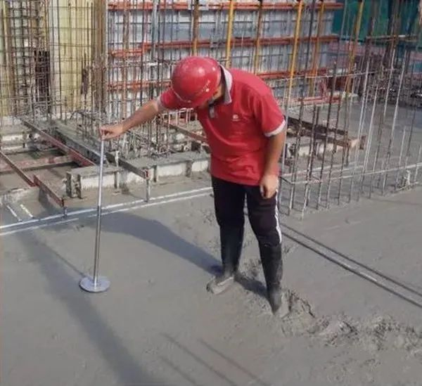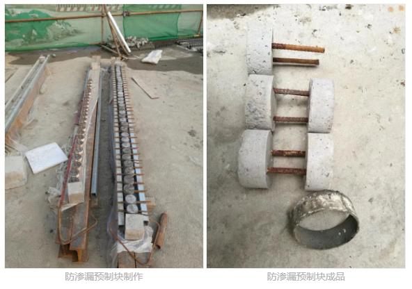 (4)浇筑过程中,禁止工人踩踏、故意损坏以及振动棒在振动过程中触碰,以免造成松动,混凝土收面时,以自制防渗预制块为参照进行铝合金刮尺收面。