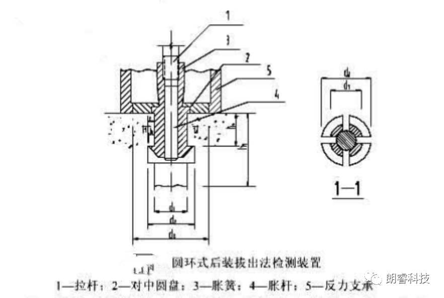 i.圆环式后装拔出法检测:返力支撑内径d3宜为55mm,锚固件的锚固深度h宜为25mm,钻孔直径d1宜为18mm。