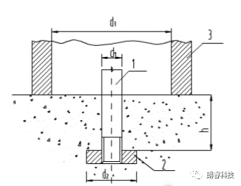 ii.圆环式预埋拔出法:返力支撑内径d3宜为55mm,锚固件的锚固深度h宜为55mm,拉杆直径d1宜为10mm,锚盘直径d2宜为25mm。