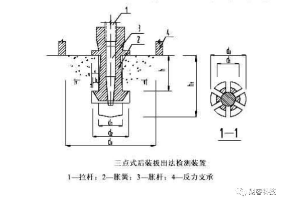 iii.三点式后装拔出法:反力支撑内径d3宜为120mm,锚固件的锚固深度h宜为35mm,钻孔直径d1宜为22mm。
