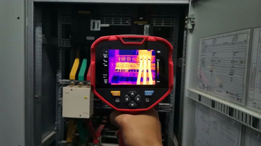 通过UTi384H手动调焦红外热成像仪进行测量,汇流箱中各支路的电流的大小而产生的热量差异能直观地在红外热像中体现出来,红外热像仪能够正确引导发现接头松动或接触不良、不平衡负荷、过载、过热等隐患,对电气或设备的运转情况进行准确判断。