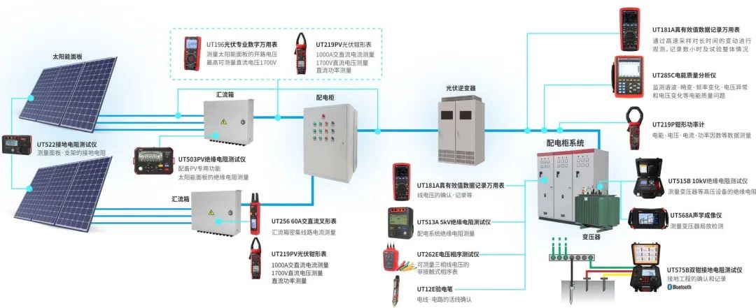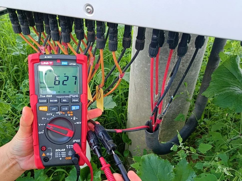 通过UT196光伏万用表可测直流电压高达1700V,交流高达1500V电压测量,判断发电输出电压是否正常。