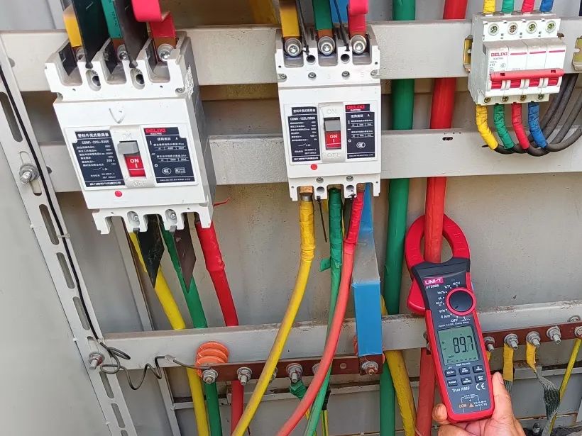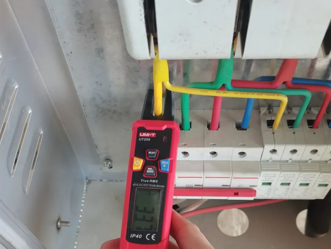 通过UT208B 1000A交直流钳形电流表测量检测各相电流并评估各相工作是否正常;测量汇流箱各相电流大小,评估分析电流各相电流平衡状况。