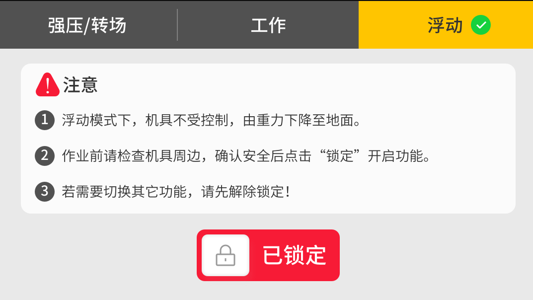 机具通过自身重力在土地表面作业。通过模式锁定才能开启该功能,安全可靠。