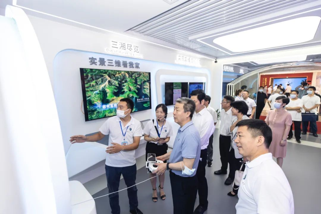 在湖南实景三维成果展厅,与会人员观看了以“实景三维绿心”、实景三维创新服务张家界旅发大会等为代表的新技术、新产品,身临其境感受“三湘尽览、物联感知、智能调度”的实景三维湖南正以其全方位、实时性、多样化的特点赋能自然资源管理、支撑全省经济社会发展。