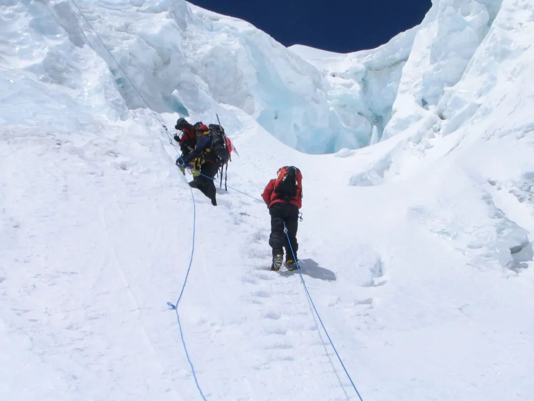 2005年珠峰复测,图中右起柏华岗、任秀波、阿旺给吨在攀登6800米冰壁。刘西宁 摄