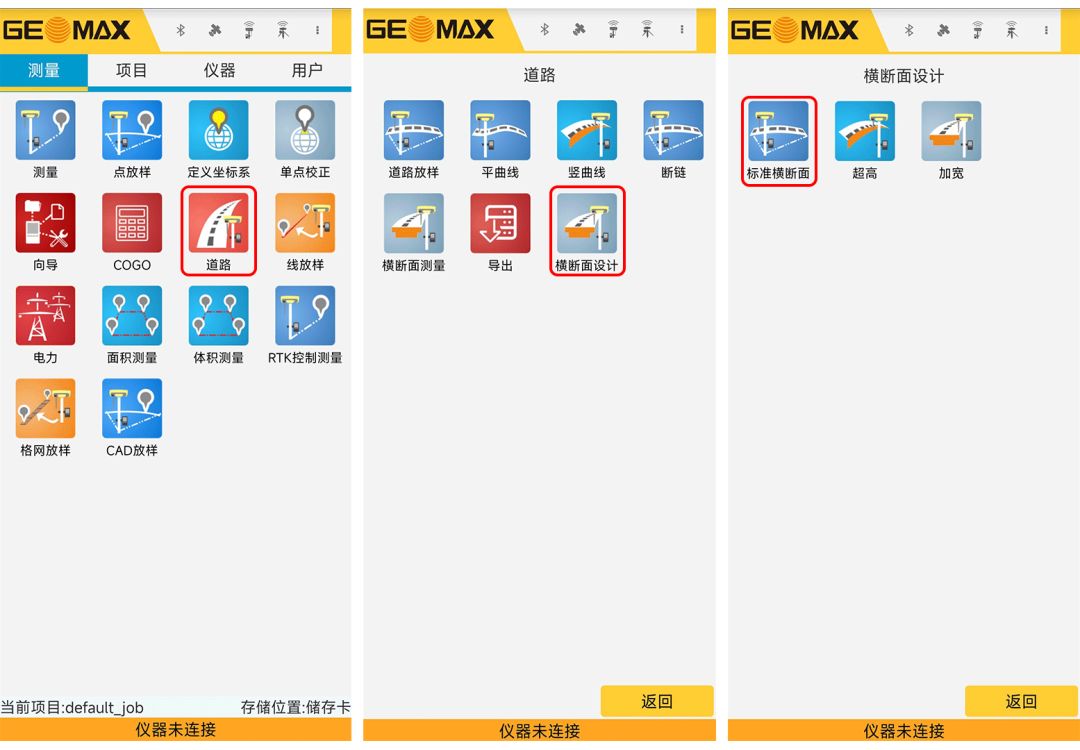 在测量主界面点击【道路】,进入道路程序主界面。点击【横断面设计】,然后选择【标准横断面】,进入横断面设置界面。