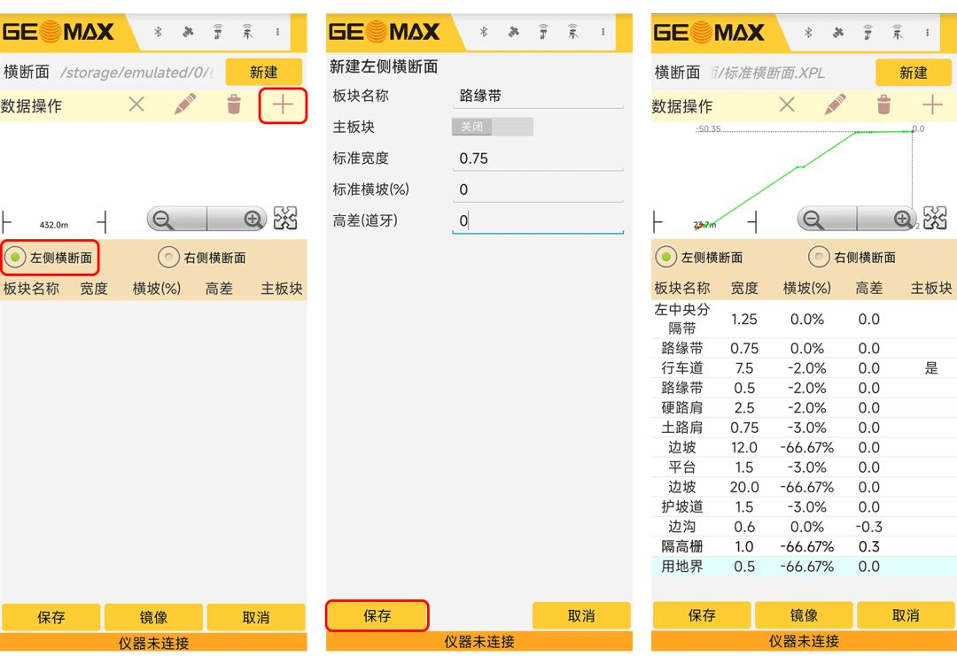 选择“左侧横断面”,点击“+”,输入板块名称、标准宽度、标准坡度(%)、高差(道牙),并选择是否为主版块(一般以行车道为主版块)。