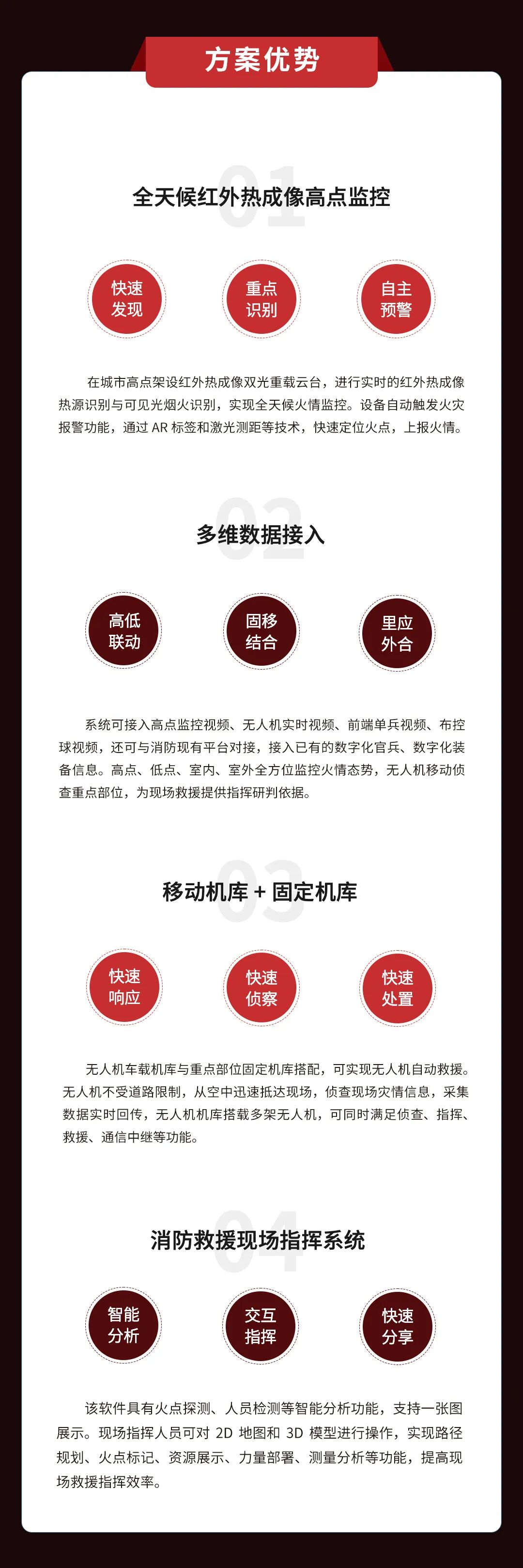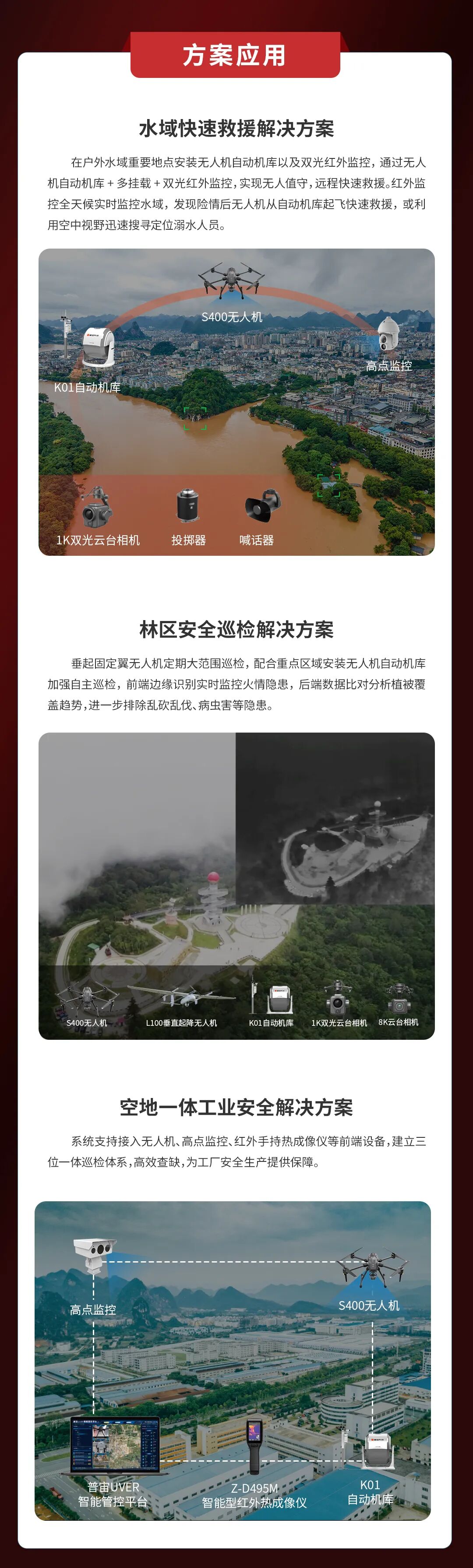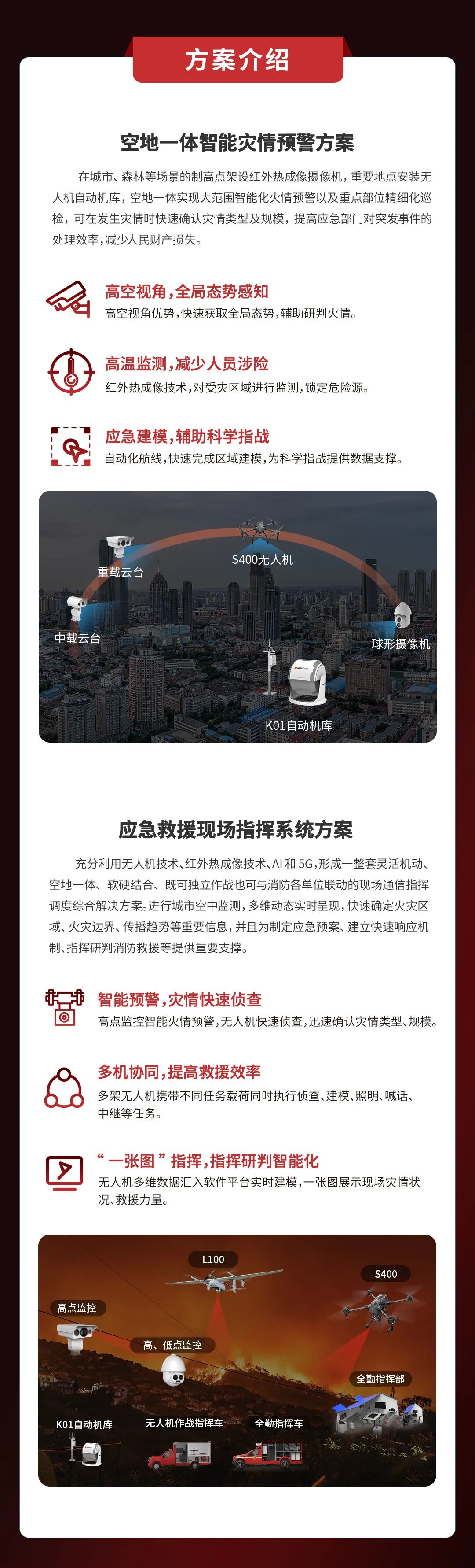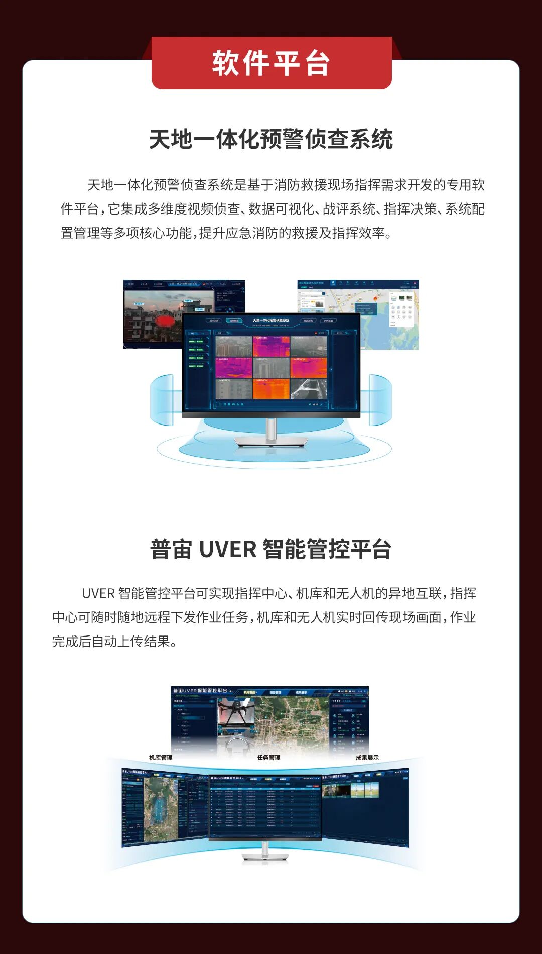 2019年,普宙科技为某市支队建设天地一体化预警侦察系统,包括55套无人机、4个点位高点监控以及配套软件平台。实现无人机、高点监控视频汇聚,自动火情报警等功能,有效提升了支队火情预警能力。2020年4月青岛小珠山火灾,普宙科技无人机赶往现场支援,使用无人机加红外热像设备全天候监控火情蔓延趋势,视频实时回传至指挥中心,为现场指挥提供研判依据,大大提升了救援效率。2020年6月,普宙科技携手某市林草局打造出包括无人机、红外双光云台摄像机以及软件平台在内的天地一体预警系统,通过高点瞭望+热成像智能识别,即可全天候自动监控火情隐患,为辖区防火防控工作提供数据支撑。
