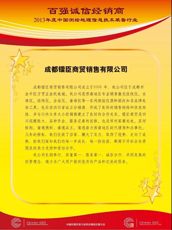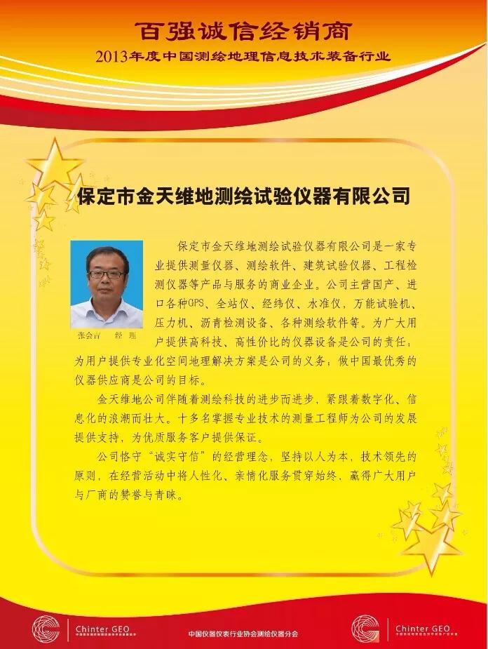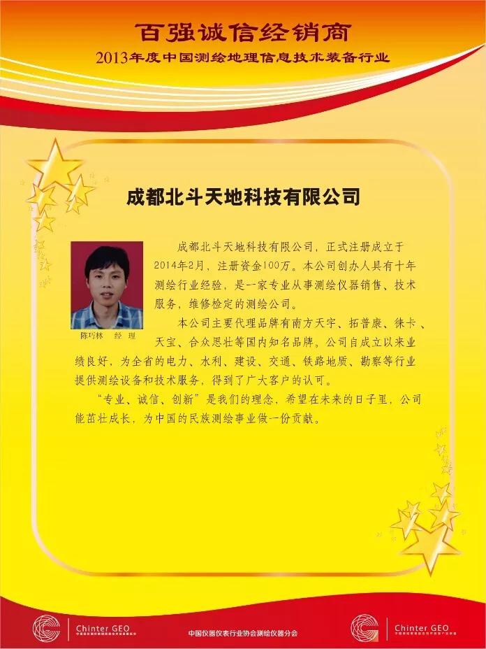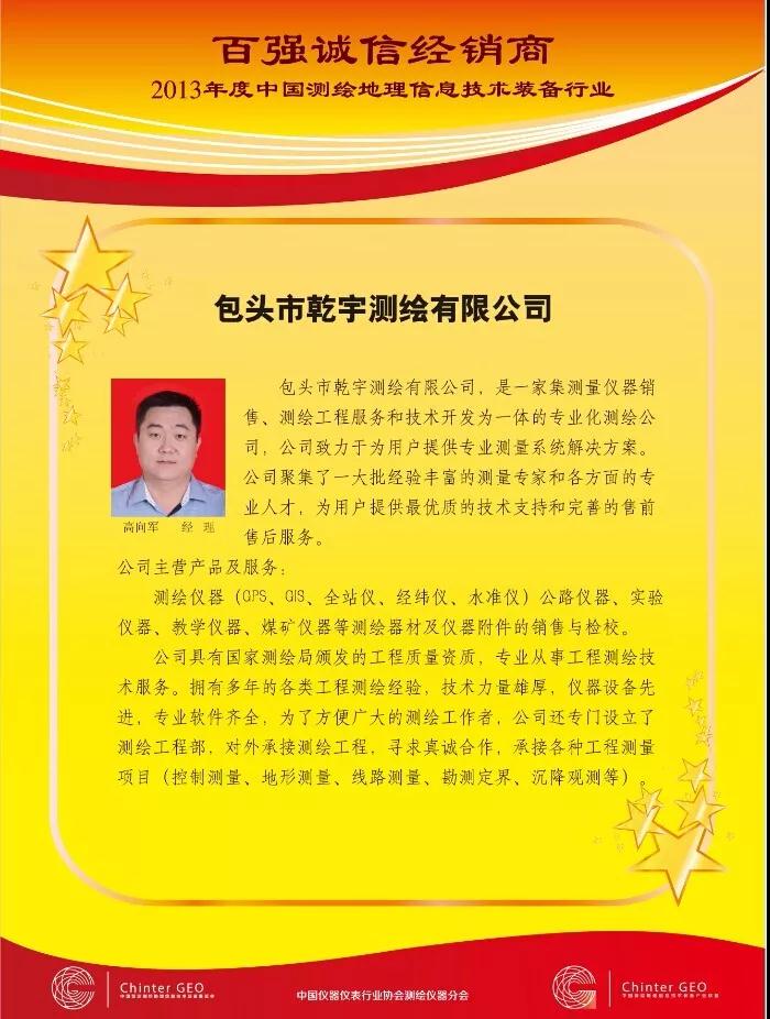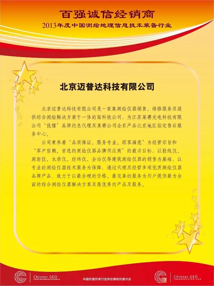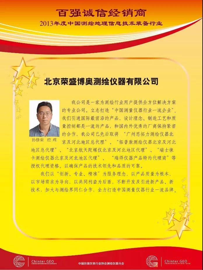 2、展会期间举行授奖牌仪式、由测绘地理信息行业领军企业代表对“百强诚信经销商”进行颁奖。