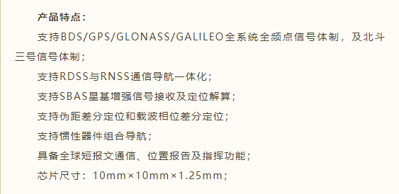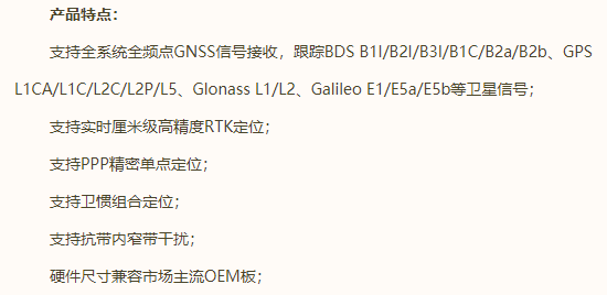 一款具有完全自主知识产权的多系统多频点高性能基带芯片,采用12/14nm FinFet先进工艺,具备小尺寸与超低功耗特点,能提供毫米级定位精度,独创双CPU+高性能矩阵加速器,支持100HZ级别的RTK定位定向解算