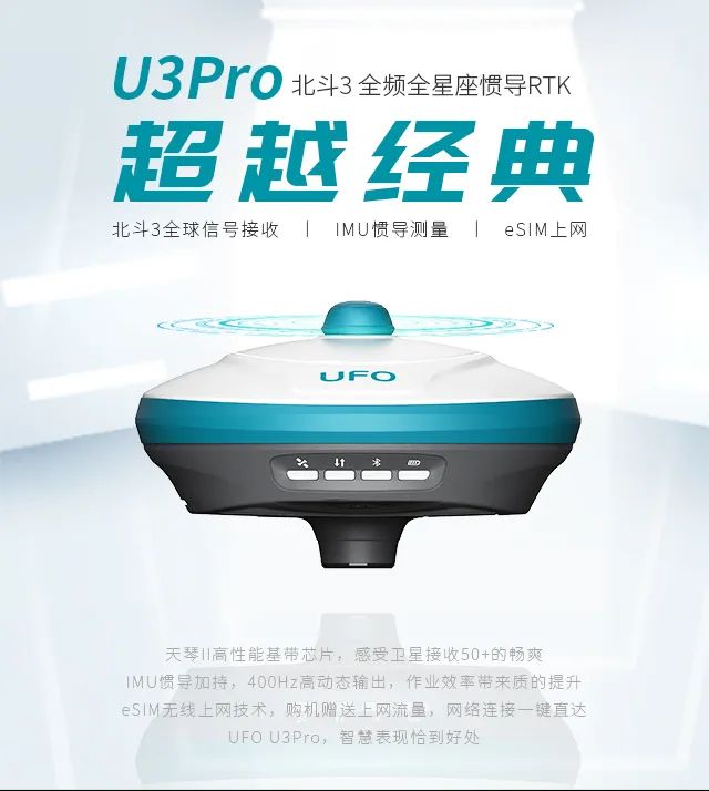 轻巧的重量与靓丽的外观是UFO的一直追求,拿在手中,更小的尺寸与更轻的重量让人爱不释手,它是RTK界“漂亮的不像实力派”的产品。“天空之眼”的设计内蕴藏的是上置电台接收天线,让我们换个方向,遇到更好的信号。800通道,能够跟踪当前及未来规划的所有卫星系统的所有频段,同时配备了Cygnus硬件抗干扰技术,与先进的55nm制程,给你带来超强的卫星跟踪和捕获能力。来自宇宙设计灵感的外形“天空之眼”,由荣获IF和Red Dot设计师操刀设计,“天空之眼”即顶置UHF天线接口,其抗遮挡、接收效果更佳,科技与艺术跨界融合。U3Pro内置eSIM上网,可不插卡联网,同时保留SIM卡槽,全网通网络模块,让联网方式多种多样。